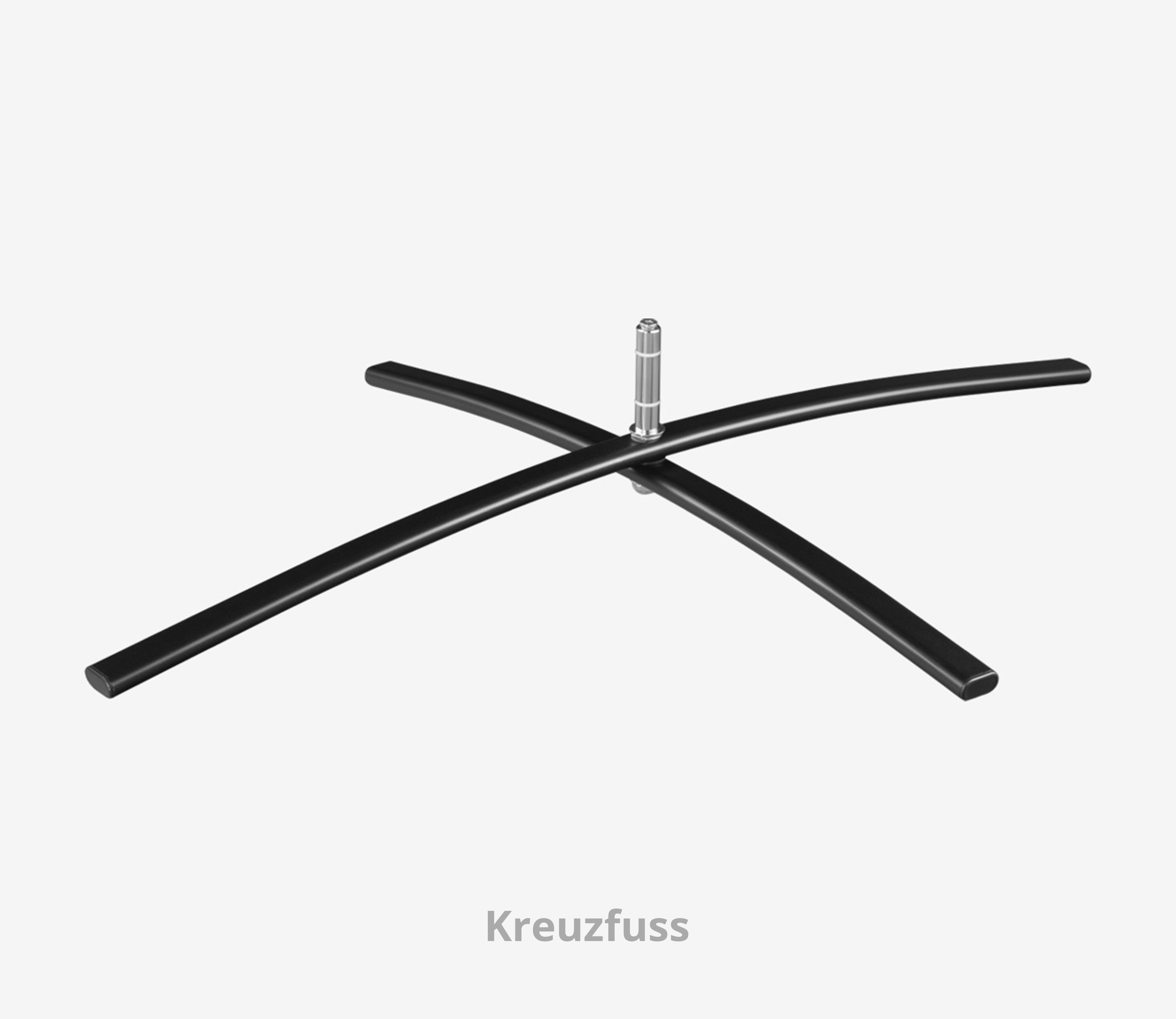 - Kreuzfuss: Geeignet für ebenes Gelände in Regionen mit mittlerem Wind, für den Innen- und Aussenbereich, auf festem Untergrund. Empfehlung mit Schlauchsack.